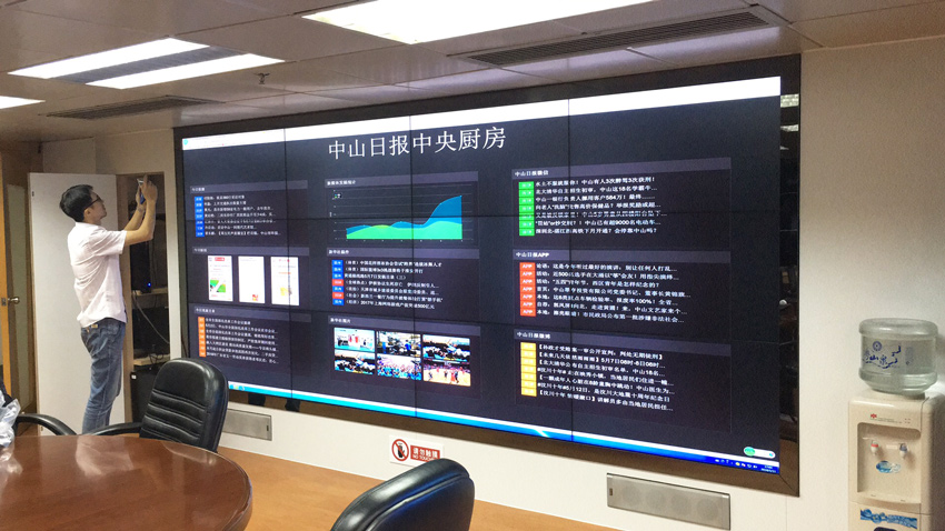 新媒體4k拼接屏_中山日報社中央廚房_信弘55寸拼接屏項目,新聞生產更有效率,更符合當代新聞傳播的特點,更好的滿足用戶需求,從而加強內容供給側改革,加速日報社向新媒體轉型。